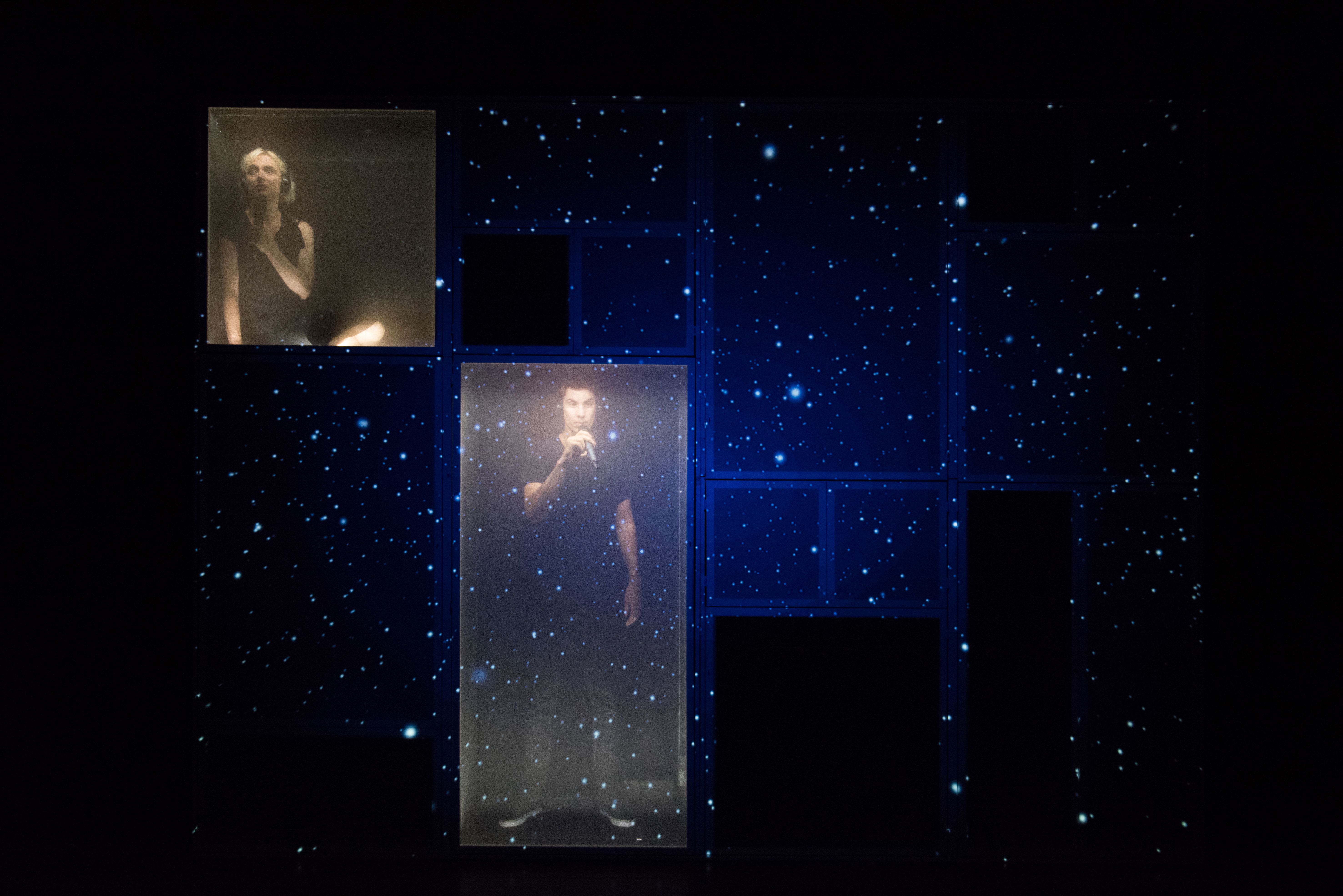 Cette part de réal­ité artic­ulée nous parvient de façon dis­tincte et pré­cise, pour être aus­sitôt défor­mée dans l’espace. Ce que le spec­ta­cle gagne d’un côté en réal­isme est immé­di­ate­ment con­tre­bal­ancé en étrangeté (inquié­tante ou non) par les inter­mèdes visuels.