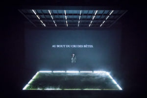 Julien Gosselin s’efforce de faire coïncider théâtre et lecture : « rien ne m’émeut plus que l’objet qui raconte quelque chose de plus, qu’il dise quelque chose, qu’avec le texte on ait presque deux œuvres contiguës qui se rencontrent et que le reste des ponts de connexion entre les deux objets soient faits par le spectateur »4, dit-il. C’est particulièrement le cas dans Le Père, avec Laurent Sauvage, où il cultive comme personne l’attente et la frustration du spectateur. Ce dernier, longtemps plongé dans le noir, puis fasciné par une lumière blanche, entend la voix du comédien avant de finir par voir, presque palpable, un homme debout sur une pelouse. Les voix enfantines y sont exclusivement à lire, projetées sur un grand écran. Ce processus, accompagné d’une musique électronique forte, qui s’approche des pulsations cardiaques, ramène, fatalement, le spectateur à sa solitude. Et, par un curieux effet retour, le fait exister plus fort, lui permettant de retrouver une sorte de solitude de la lecture.