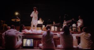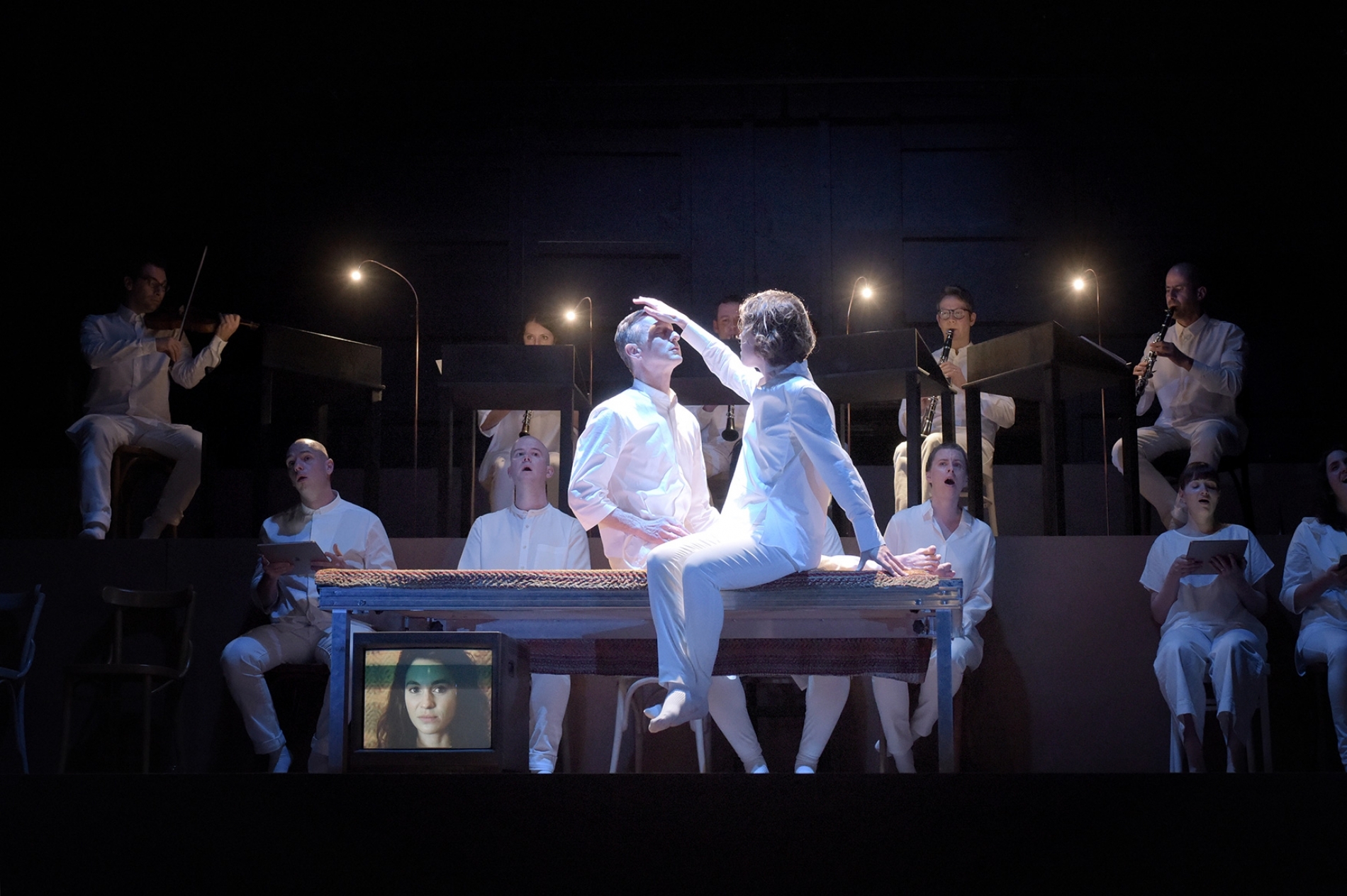 Cette pro­fonde incer­ti­tude du sens dans le cos­mos – un thème de sci­ence-fic­tion –  aurait pu appeller une  scéno­gra­phie col­orée à la Mœbius. Mais dans un cadre dépouil­lé, Peter Sel­l­ars a su dis­tinguer les motifs prin­ci­paux de l’opéra. Les chais­es des chanteurs dis­posées sur la scène ressem­blent à des chais­es d’é­cole, mais aucune ne ressem­ble aux autres. Les pupitres des musi­ciens, eux aus­si, s’ap­par­entent à des pupitres d’é­col­iers, et les cos­tumes blancs ren­voient bien sûr à la pureté, à la purifi­ca­tion, peut-être aus­si à la mort, bien qu’au­cun ne soit non plus sem­blable aux autres. La pièce sug­gère alors une forme de con­so­la­tion qui n’évite pas la tristesse mais la con­fronte à la douceur de l’en­fance. Quelques gestes suff­isent alors à sug­gér­er l’ac­tion rit­uelle : un gisant se lève et devient flamme, on se couche pour s’en­dormir, et l’opéra bas­cule dans un autre espace, celui des rêves – où le corps s’al­lège, où le temps se détache, où tout est par­don­né.
