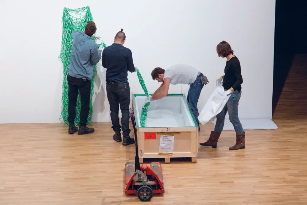 « Performer l’art », ici, c’est donc performer les coulisses du monde de l’exposition et leur faire investir la scène ; ouvrir, comme y invite Bruno Latour, sociologue curieux de la manière dont on fait « tenir la réalité », les boîtes noires de l’art. Et pour cela, suggère Performing Art, il y a bien des boîtes à ouvrir, requérant des outils et des manipulations ; des gestes à faire, minutieux et rodés ; des manières de faire ensemble et de s’ajuster pour déplier, ranger, faire tenir, proprement et avec soin ; des chariots, des trous, des soudures, et les bruits qui vont avec. L’art est une performance équipée. Si les arts plastiques sont un processus concret, semble dire Noé Soulier, sa matérialité ne se livre pas uniquement dans l’extase sauvage d’un Jackson Pollock ou les rituels d’un Yves Klein baignant les corps dans la matière avant d’en recueillir l’empreinte, en somme dans ces engagements physiques de plasticiens qui se prêteraient presque naturellement à la chorégraphie. Noé Soulier regarde ailleurs ce qui danse, ou du moins ce qui bouge : dans les bruissements mêlés des objets et des hommes, dans ce travail modeste avec les choses, dans les coopérations intimes qu’elles exigent pour former le musée.