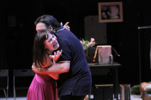 L’espace vide (vide du plateau où ils s’aiment et se déchirent- et vacuité de leur existence) où se débattent les personnages est prolongé par une très belle sculpture lumineuse et mobile, jardin extérieur de cette villa « douloureuse » dont les habitants n’ont pas l’air de vouloir jouir, perdus dans des soirées d’anniversaire qui répètent inlassablement la même dérive alcoolisée.