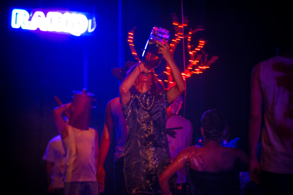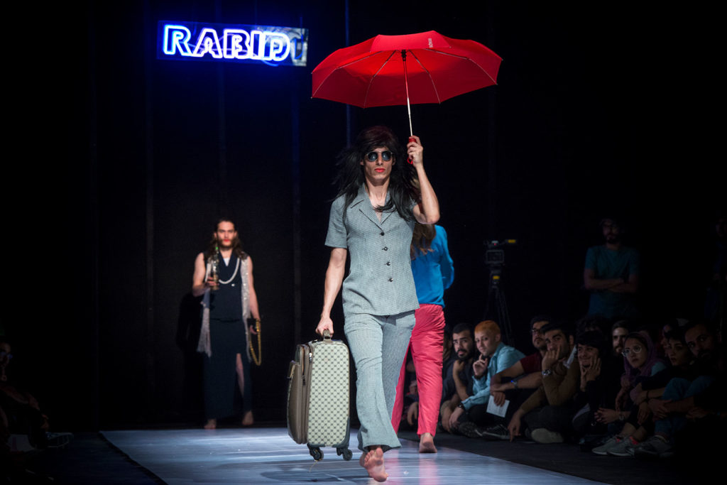 L’individu appa­raît d’abord sur la scène comme effacé. Ain­si, Hos­sein Pouri­ani (né en 1989) dans Enragé (Hâr, Téhéran, Molavi Hall, 2018) con­fronte ses spec­ta­teurs à une vir­u­lente cri­tique sociale. Le spec­ta­cle nous présente un monde exclu­sive­ment mas­culin où la parole est totale­ment absente et expose une généra­tion en souf­france. Sur scène, onze hommes plutôt jeunes défi­lent sur un tapis blanc au rythme d’une musique d’ambiance. Tout débute par ce qui a l’apparence d’un banal défilé de man­nequins ; mais assez rapi­de­ment, les vête­ments, les objets, les maquil­lages, les per­ruques, les couleurs et les bijoux sont détournés et pren­nent un autre sens : alors que l’un des hommes grat­te une main arti­fi­cielle en sil­i­cone avec une râpe, un autre se met à arpen­ter le cat­walk avec des ampoules allumées à l’endroit de l’estomac. On voit même défil­er Vladimir et Estragon – cha­peau mel­on sur la tête et bas­kets aux pieds – trans­portant leur arbre. Ils dévoilent ain­si des indi­vidus écrasés sous le poids des biens matériels (et en pre­mier lieu de l’argent) et de l’apparence. Dans cette bataille de super­fi­cial­ité, ils sem­blent prêts à pass­er sur les cadavres de leurs sem­blables. Lorsque s’achève le spec­ta­cle, il ne reste plus que les objets sur le tapis blanc, tan­dis que les hommes con­tin­u­ent leur défilé autour de ceux-ci.
