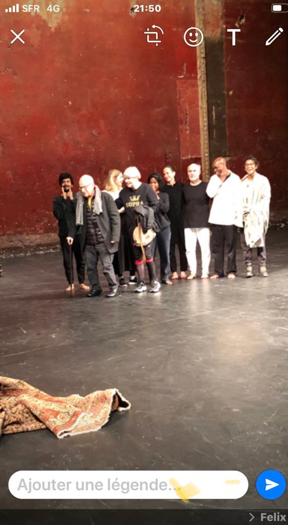 Puis, il se lève et, de nou­veau aidé, prend place au pre­mier rang de ce théâtre mag­ique, les Bouffes du Nord, et, par­mi nous, il assiste à « la réso­nance de la Tem­pête », texte qui l’a accom­pa­g­né toute une vie ! A ses débuts en Angleterre, puis à l’époque de l’errance en 68 et lors de l’installation dans les ruines des Bouffes, pour y faire retour dans les années 😯 où son grand parte­naire d’alors Sotiguy Kouy­até jouait un Prospéro africain plus à même de se livr­er à des opéra­tions de magie qu’un acteur occi­den­tal ! Aujourd’hui sur le plateau nous iden­ti­fions des traces épars­es du par­cours comme sur le chemin d’un con­te réputé : le petit bateau rouge dont jadis l’ancien Ariel était paré, un tapis usé qui ren­voie à la Ceri­saie et à la Con­férence des oiseaux, les bâtons de bam­bou, alliés du pre­mier jour…, je les regarde et je me sou­viens ! Du coin de l’œil je remar­que Peter et Marie-Hélène assis, l’un à côté de l’autre, qui avan­cent ensem­ble sur la voie du théâtre, tels Œdipe et Antigone !