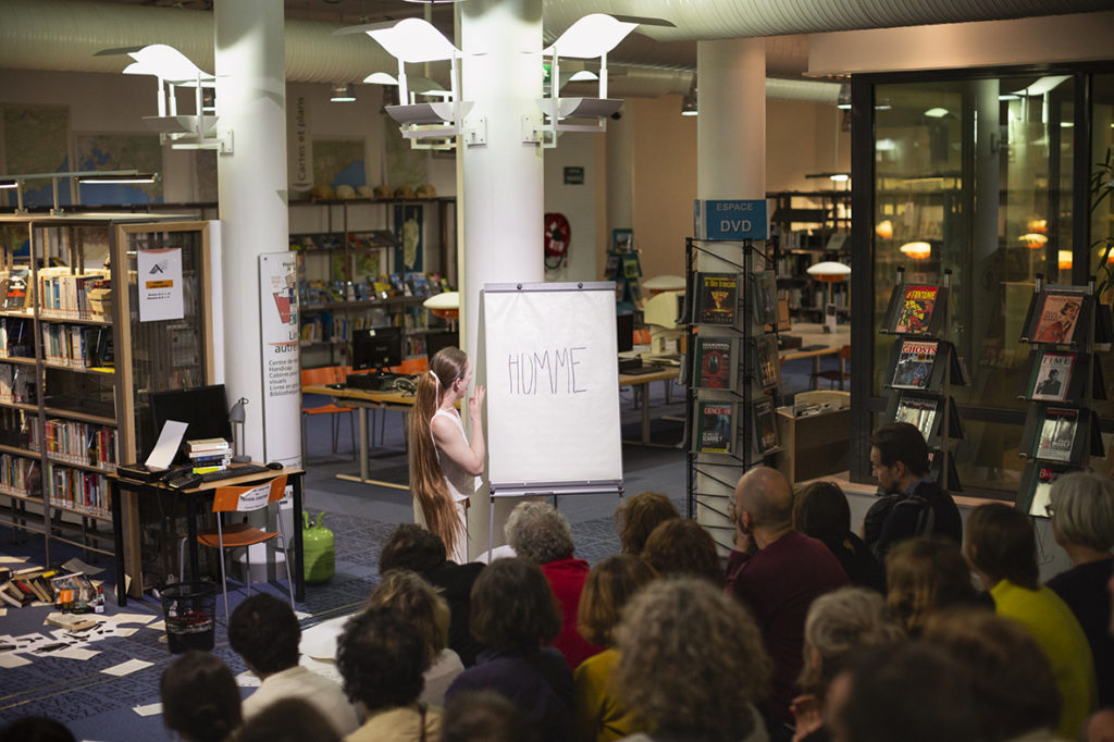 Il a été conçu pour être donné dans des bibliothèques, les représentations faisant l’objet d’une intégration particulière propre à chaque espace, associant la ou le bibliothécaire, utilisant avec ingéniosité les objets, portes, livres, « bibliothèques », rayonnages qui s’y trouvent.
