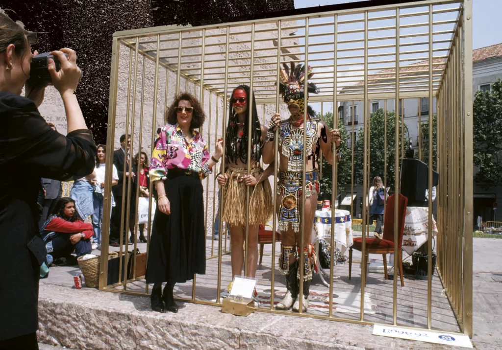 TWO UNDISCOVERED AMERINDIANS, appelée aussi THE COUPLE IN THE CAGE, est une œuvre de performance créée en 1992 par Coco…
