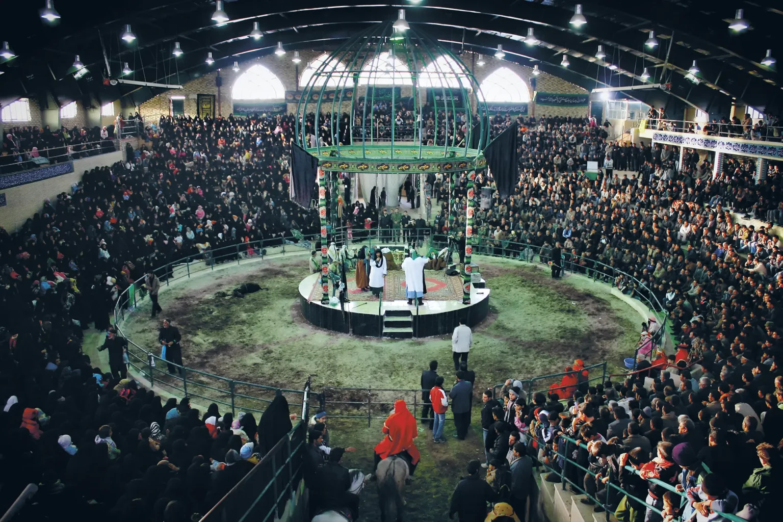 Lors de la représentation, les « amis » de l’Imam Hossein vêtus en vert et ses « ennemis » habillés en rouge s’opposent et, chaque jour, représentent l’événement correspondant aux faits historiques qui se sont déroulés ce même jour en l’an 680.