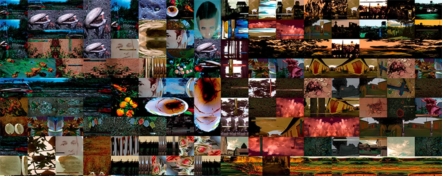 Et j’ai com­mencé à retra­vailler chaque image, en éti­rant, en trans­for­mant, en sat­u­rant, en den­si­fi­ant des teintes. Des gens sont passés en me dis­ant : « Mais tu es com­plète­ment folle, tout le monde utilise Pho­to­shop ». Mais ça ne m’intéressait pas. C’était un lan­gage for­maté. Je préfère gliss­er dans mon dic­tio­n­naire Word mes nou­veaux et pro­pres mots qu’il va accepter, qu’il va met­tre dans son estom­ac. Et avec un sim­ple traite­ment de texte, j’ai com­mencé à tra­vailler ça, et il en est sor­ti comme la dra­maturgie d’une soli­tude et du temps, soit le temps que j’ai passé à laiss­er venir des sujets vers moi sans aucun volon­tarisme. J’ai com­mencé à assem­bler cette matière et il en est sor­ti ce que j’ai appelé des tableaux : cinq tableaux qui gravi­tent autour de cinq règles bien dif­férentes mais con­comi­tantes. Comme je n’avais pas l’outil ter­mi­nal pour finalis­er les choses, j’ai fait des cap­tures d’écran à cer­tains moments pour me ren­dre compte de l’assemblage, pour avoir un ensem­ble parce que je n’avais pas dix écrans devant moi… Et il en est sor­ti comme ça cinq tableaux qui décli­nent selon une cer­taine façon intu­itive ce « lone­ly vil­lage » où des mêmes détails, mais à l’échelle micro­scopique, se retrou­vent. Donc tu as cinq con­stel­la­tions, mais tou­jours autour de ce « lone­ly vil­lage » avec ces enfants qui n’arrêtent pas de courir et qui sont repris de manière dif­férente, isolés, éclatés, à l’intérieur d’un tableau. Chaque tableau con­tient qua­tre-vingt images ; chaque image est com­posée elle-même de plusieurs images que j’ai trans­for­mées, que j’ai assem­blées en une phrase. Il y a une longue phrase qui s’est écrite comme ça, qui se présente en cinq tableaux.