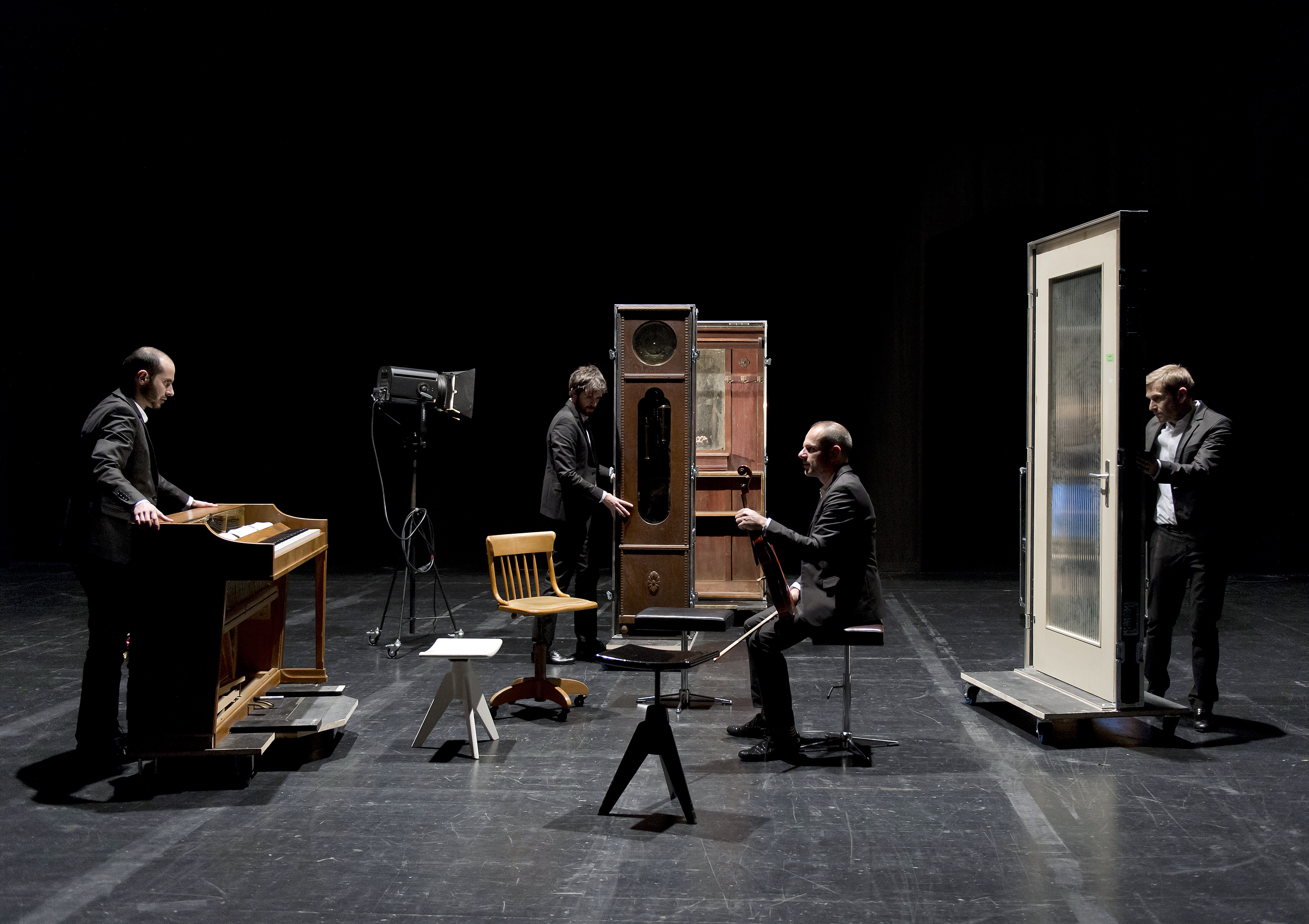 Patience camp, sa première mise en scène à Bâle en 2007, relatait déjà un échec. Le récit de la tentative de traversée de l’Antarctique par Sir Shackleton en 1913 et de l’attente de l’équipage dans le navire bloqué par les glaces était restitué par quatre comédiens avec des moyens sommaires – une porte sur roulette, un harmonium mobile, une vieille carte du monde, une guitare, une machine à neige et trois tréteaux simples en bois. Au rêve de l’explorateur finalement contraint de revenir sans être parvenu à réaliser son exploit, et à l’attente de l’équipage dans le navire avant le renoncement, correspondait la tentative modeste mais ardemment vécue des acteurs à restituer ensemble le récit, toujours visiblement à la limite de l’échec eux aussi. Ce premier spectacle posait les bases de ce qui fait encore le théâtre de Luz aujourd’hui : une scène essentiellement vide accueillant des éléments de décor mobiles – portes sur roulettes, piano ou harmonium, échelles ou machines de technique de théâtre (grue, nacelle…), lampes mobiles variées, machines à fumée utilisées par les comédiens… et le plus souvent quatre ou cinq interprètes qui sont aussi bien acteurs, chanteurs que musiciens s’adressant frontalement aux spectateurs pour partager le récit d’une aventure improbable.