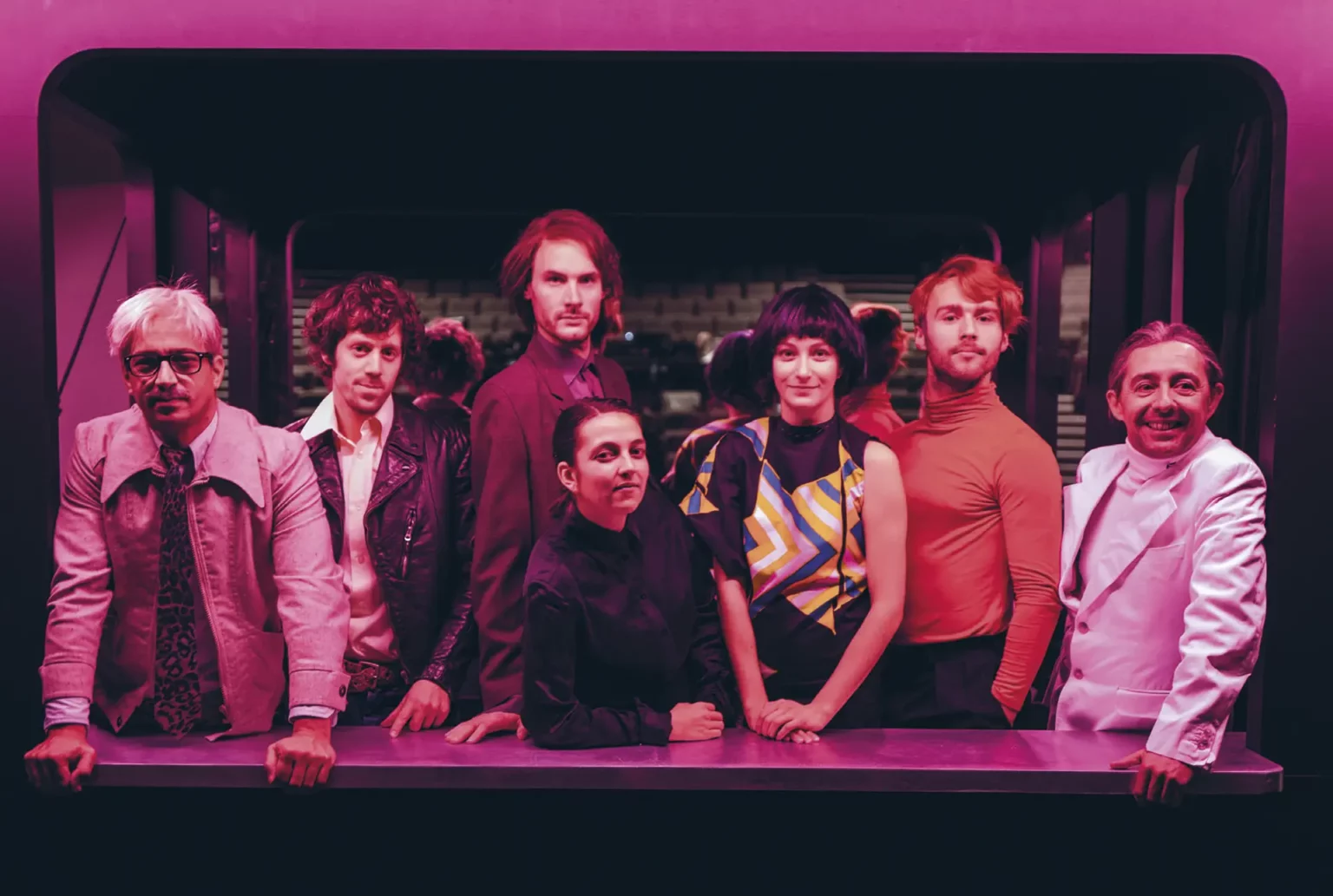 Rachid Zanouda, Arthur Amard, Simon Terrenoire, Elsa Verdon, Alicia Devidal, Valentin Clerc, Pierre Maillet dans Le Bonheur (n’est pas toujours drôle), d’après trois scénarios de Rainer Werner Fassbinder : « Le droit du plus fort », « Maman Küsters s’en va au ciel » et « Tous les autres s’appellent Ali ». Création à la Comédie de Caen, janvier 2019. Photo Nicolas Marie