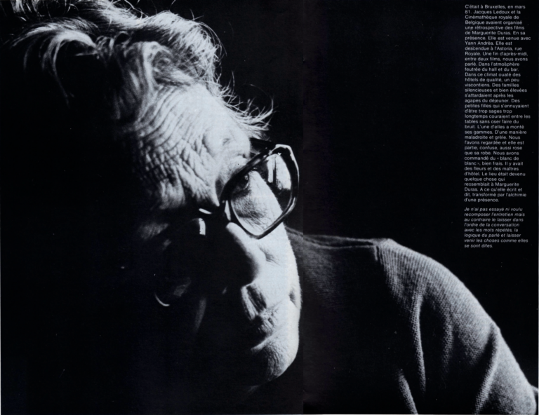C’était à Bruxelles, en mars 81, Jacques Ledoux et la Cinémathèque royale de Belgique avaient organisé une rétrospective des films de Marguerite Duras. En sa présence. Elle est venue avec Yann Andréa. Elle est descendue à l’Astoria, rue Royale. Une fin d’après-midi, entre deux films, nous avons parlé. Dans l’atmosphère feutrée du hall et du bar. Dans ce climat ouaté des hôtels de qualité, un peu viscontiens. Des familles silencieuses et bien élevées s’attardaient après les agapes du déjeuner. Des petites filles qui s’ennuyaient d’être trop sages trop longtemps couraient entre les tables sans oser faire du bruit. L’une d’elles a monté ses gammes. D’une manière maladroite et grêle. Nous l’avons regardée et elle est partie, confuse, aussi rose que sa robe. Nous avons commandé du « blanc de blanc » bien frais. Il y avait des fleurs et des maîtres d’hôtel. Le lieu était devenu quelque chose qui ressemblait à Marguerite Duras. À ce qu’elle écrit et dit, transformé par l’alchimie d’une présence.