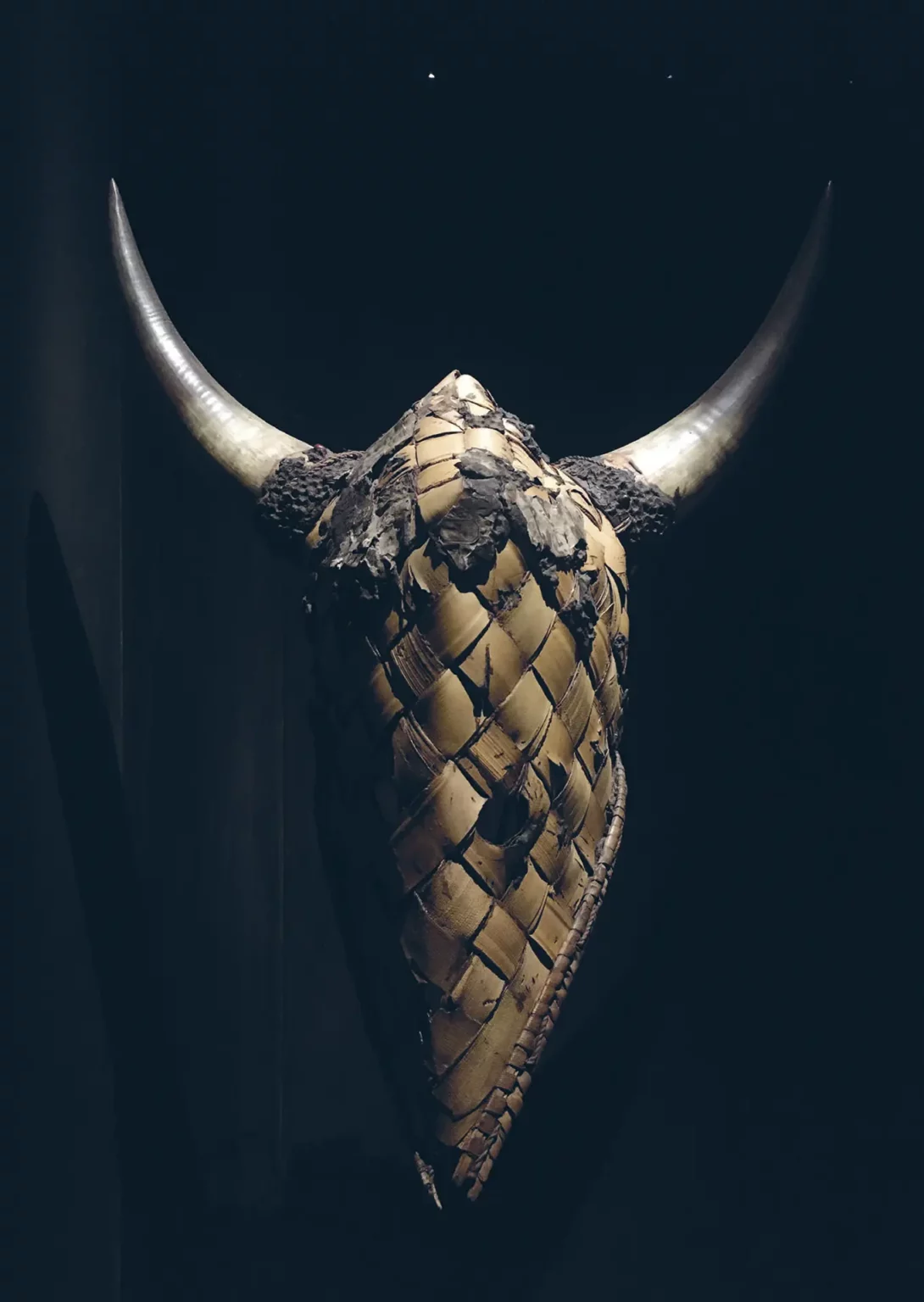 C’est un masque très sim­ple, presque min­i­mal­iste : en forme de heaume, fait d’une écorce végé­tale tressée en larges damiers, il est de forme allongée avec une arête cen­trale légère­ment mousse, et mesure env­i­ron quar­ante cinq cen­timètres de hau­teur pour trente huit cen­timètres de largeur max­i­male. Son som­met, tri­an­gu­laire, est sur­mon­té de deux cornes de bœuf fixées à l’aide d’une résine som­bre (cire d’abeille ?). Deux ori­fices cir­cu­laires ont été amé­nagés pour les yeux, de part et d’autre de l’arète cen­trale, à mi-hau­teur. Les bor­ds du masque sont bor­dés de rotin. Il ne per­siste que quelques îlots de l’enduit noirâtre (bitumeux ? résineux ?) qui recou­vrait avant la total­ité de sa sur­face, au sein duquel sont encore fichées quelques graines de pois rouge (Abrus pre­ca­to­rius L.). Au niveau de ce qui fut un front, deux lam­beaux de man­u­scrits arabes sont encore adhérents, ayant servi au rem­bour­rage de la par­tie pro­fonde du masque. Voilà. C’est à peu près tout. Tout ce qu’il reste du plus vieux masque africain con­nu1.